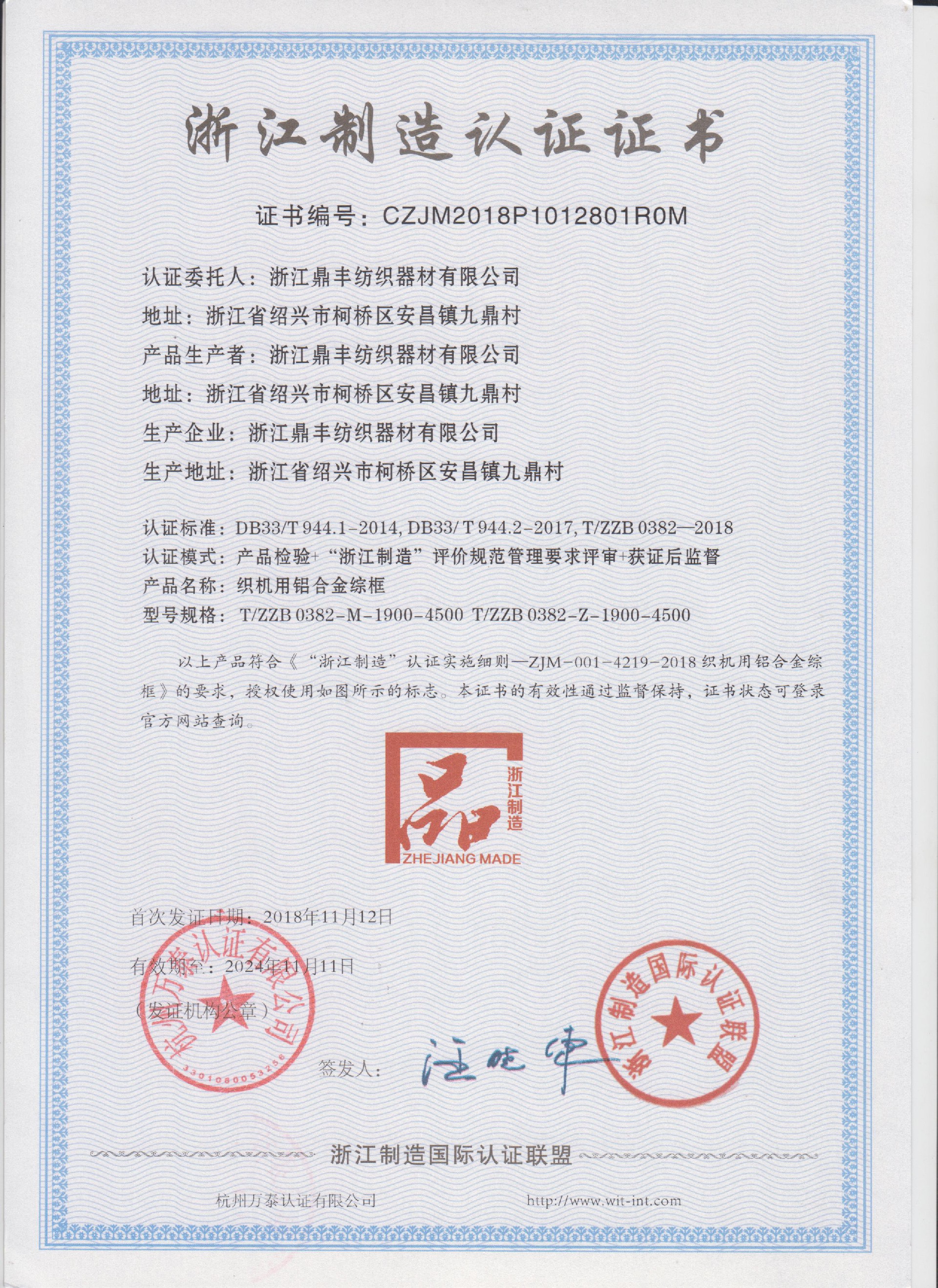 浙江鼎豐紡織器材有限公司始建于1986年,是一家專業(yè)生產(chǎn)各類無(wú)梭織機(jī)用鋼筘:噴氣筘、噴水筘、劍桿筘、其他類型鋼筘;鋁合金綜框、鋼片綜、停經(jīng)片、經(jīng)軸、織軸、卷布輥等產(chǎn)品及配件的民營(yíng)企業(yè)。